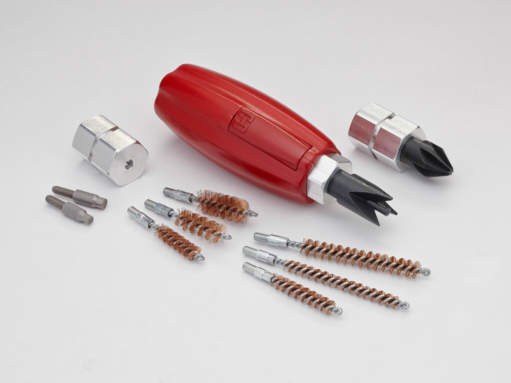 l pomo para herramientas permite emplear los cabezales más habituales de preparación de vainas de una manera ergonómica que simplifica los cambios de avellanador, chafraneador, limpiadores, cepillos o herramientas de rosca 8-32”. Permite fijar dos herramientas y cambiar rápidamente de una a otra. Diseño ergonómico destinado a reducir la fatiga. Se puede usar con todas las herramientas con rosca 8-32”. Incluye tres cabezales con rosca doble, avellanador, chafraneador, limpiadores de pistón grande y pequeño, y cepillos de cuello para los calibres, 22”; 25”/6mm; 270”/7mm; 30”; 35”/9mm; 45.