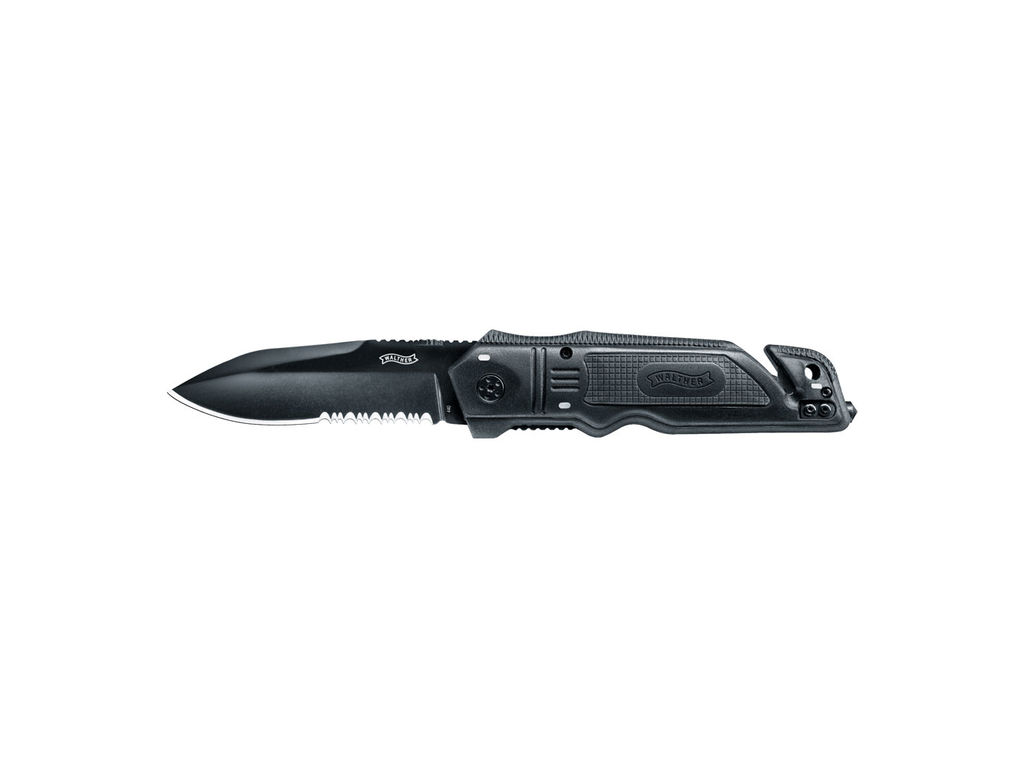 Los Cuchillos de Rescate de Emergencia Walther son herramientas cuidadosamente diseñadas que pueden salvar vidas. Sus cuchillas de acero inoxidable 440 tienen una cobertura negra y están dentadas en el tercio posterior para cortar cordones y correas. El Walther ERK tiene un mecanismo de bloqueo del revestimiento. Además de las incrustaciones de goma, cada placa de agarre de plástico también tiene tres incrustaciones fluorescentes para que el cuchillo se pueda ver en la oscuridad y se pueda agarrar correctamente. En el tercio posterior de la empuñadura se encuentran dos características muy importantes: un cortador de cinta y un rompevidrios, indispensables en caso de emergencia. Además de un clip para cinturón intercambiable, el Walther ERK viene con una resistente funda de nylon.