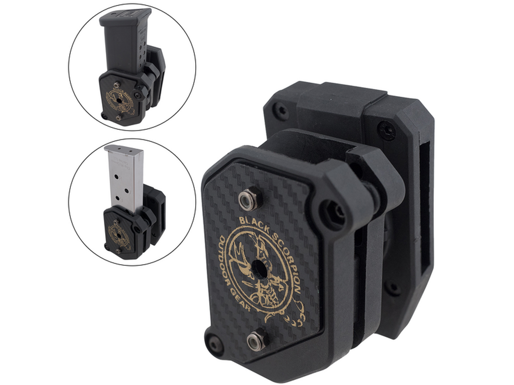 Porta cargadores tanto para zurdos como diestros. Incluye la herramienta suficiente para convertirlo. Viene listo para la mayoria de cargadores de doble hilera, pero puede ser modificado a los de hilera única.Permite ajustar la retenida del cargador simplemente girandoel botón localizado en la parte derecha. IPSC, USPSA 3 Gun.