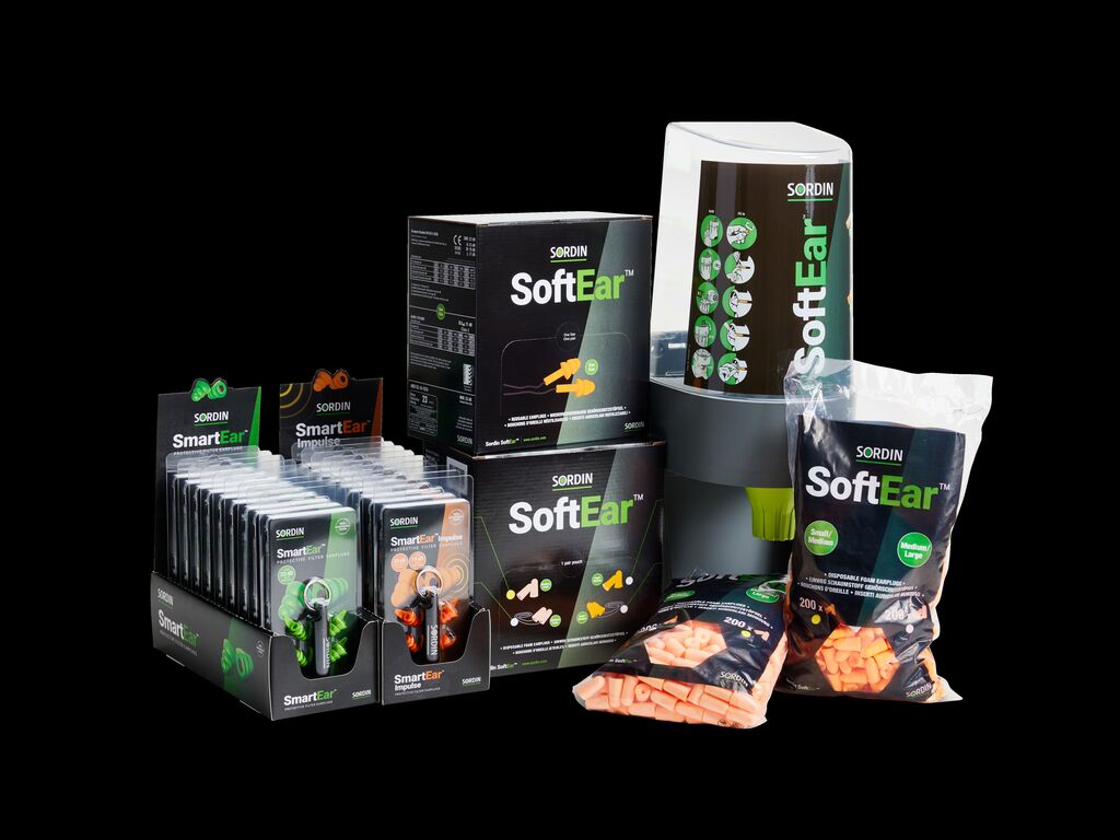 Sordin ofrece una gama completa de tapones auditivos pasivos que complementan su línea de protectores auditivos tipo diadema. Sordin SoftEar incluye cinco categorías diferentes de productos, que abarcan modelos desechables/reutilizables y con cable/sin cable. Todos los productos vienen en al menos dos variantes de tamaño diferentes para un ajuste fácil para todos los usuarios. Sordin también ofrece un dispensador reutilizable para una fácil accesibilidad.